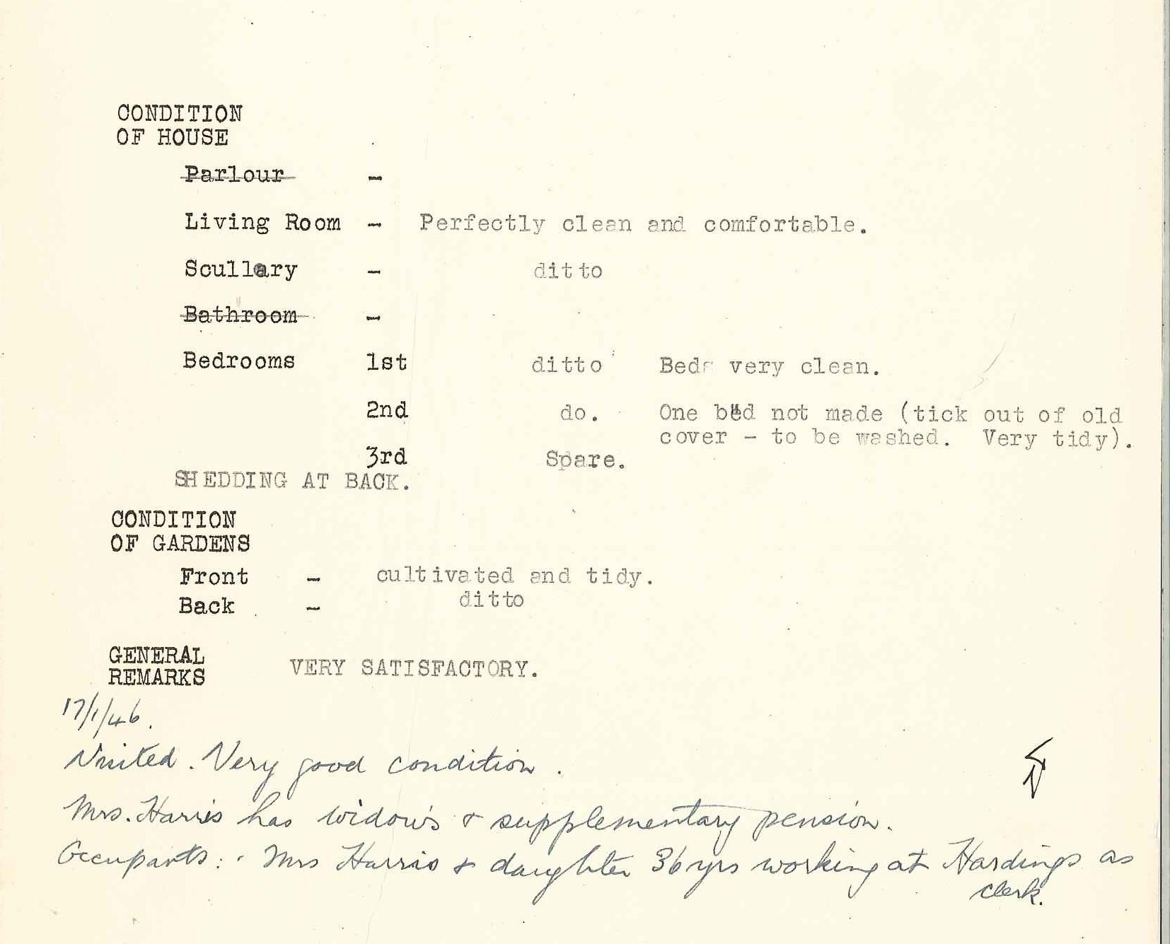 In November 1941, as German troops advance in their failed attempt to invade Moscow, the housing department visit. Presumably Mr James is away at war and they record that the house is clean and tidy, despite “one bed not made”. Underneath hand written with a sharp pencil in clear script and dated nearly 5 years later, 17th January 1946, it is noted that Mrs James has a widow’s pension. We can only guess why the men of the house are no longer present. Did they die in the war, or simply leave? The file gives no clue of their departure.